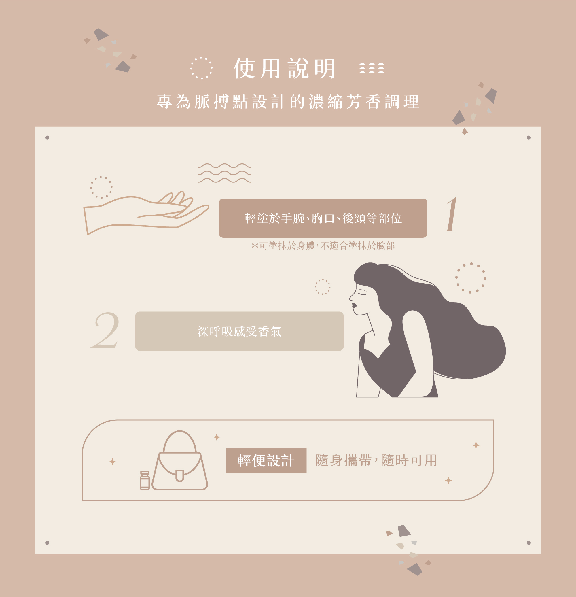 ●主要用途:專為脈搏點設計的芳香調理,喚醒專注力,穩定情緒