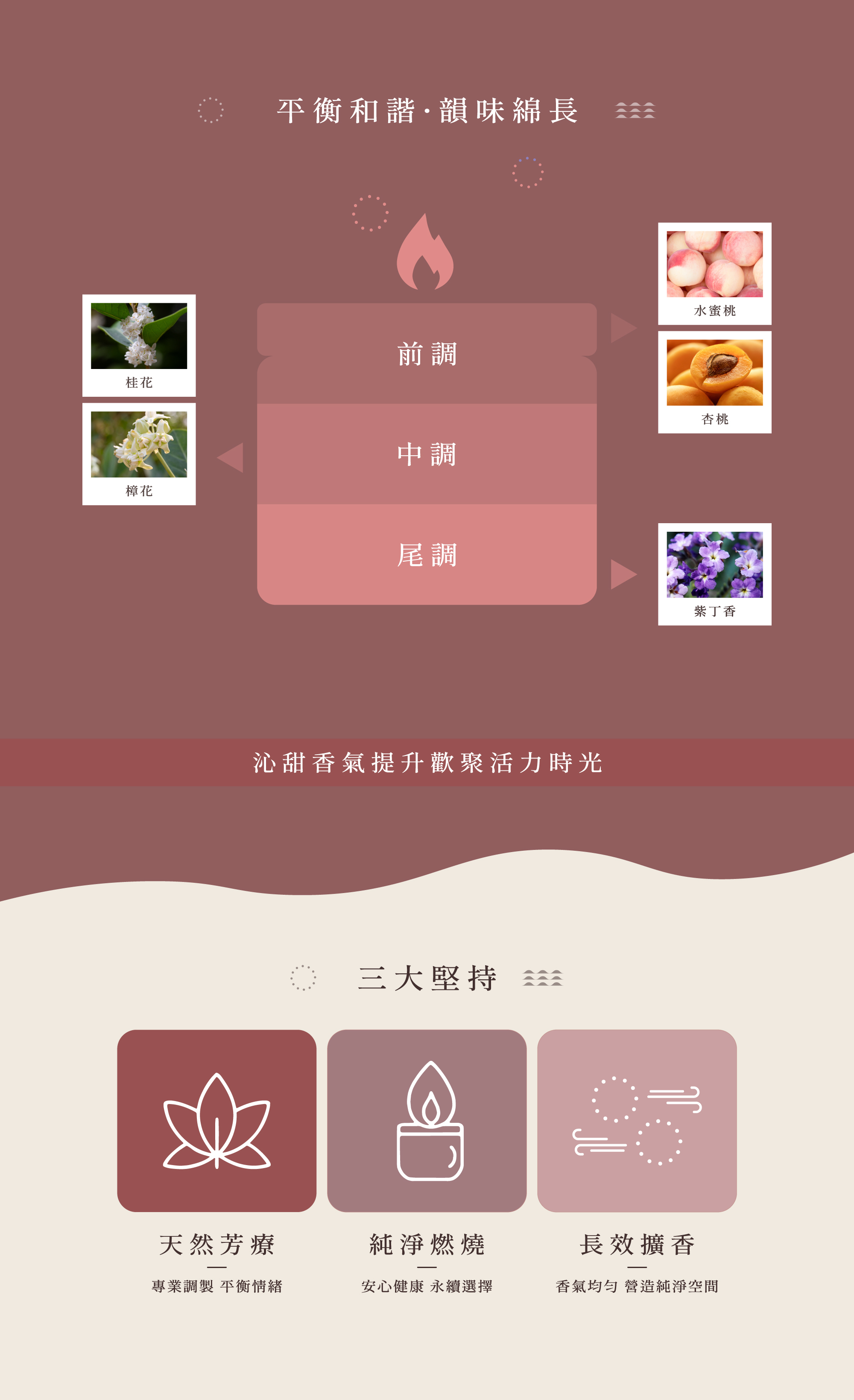 桃香桂盈香氛蠟燭融合水蜜桃、杏桃的甜美果香與桂花、樟花的淡雅花韻,點燃後如同夏日野餐般輕鬆愉悅。