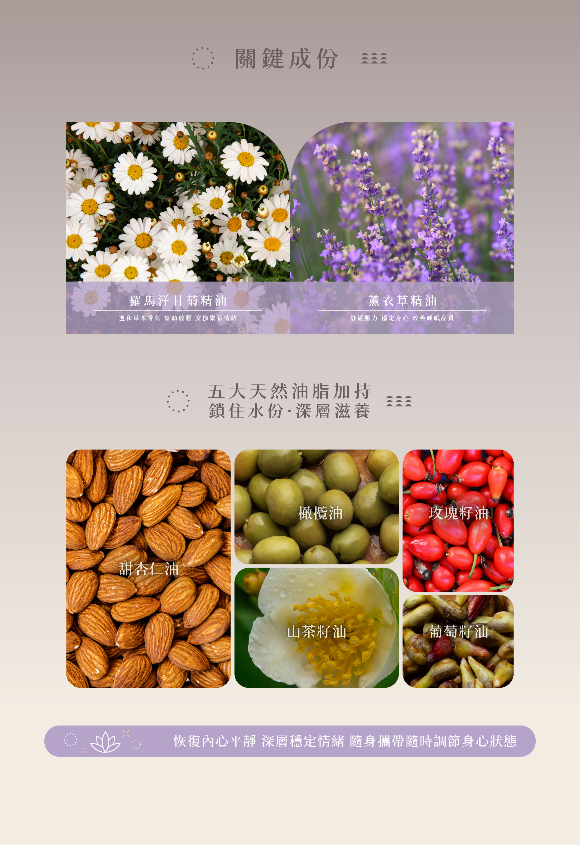 ●關鍵成份嚴選來自羅馬的洋甘菊精油及薰衣草精油