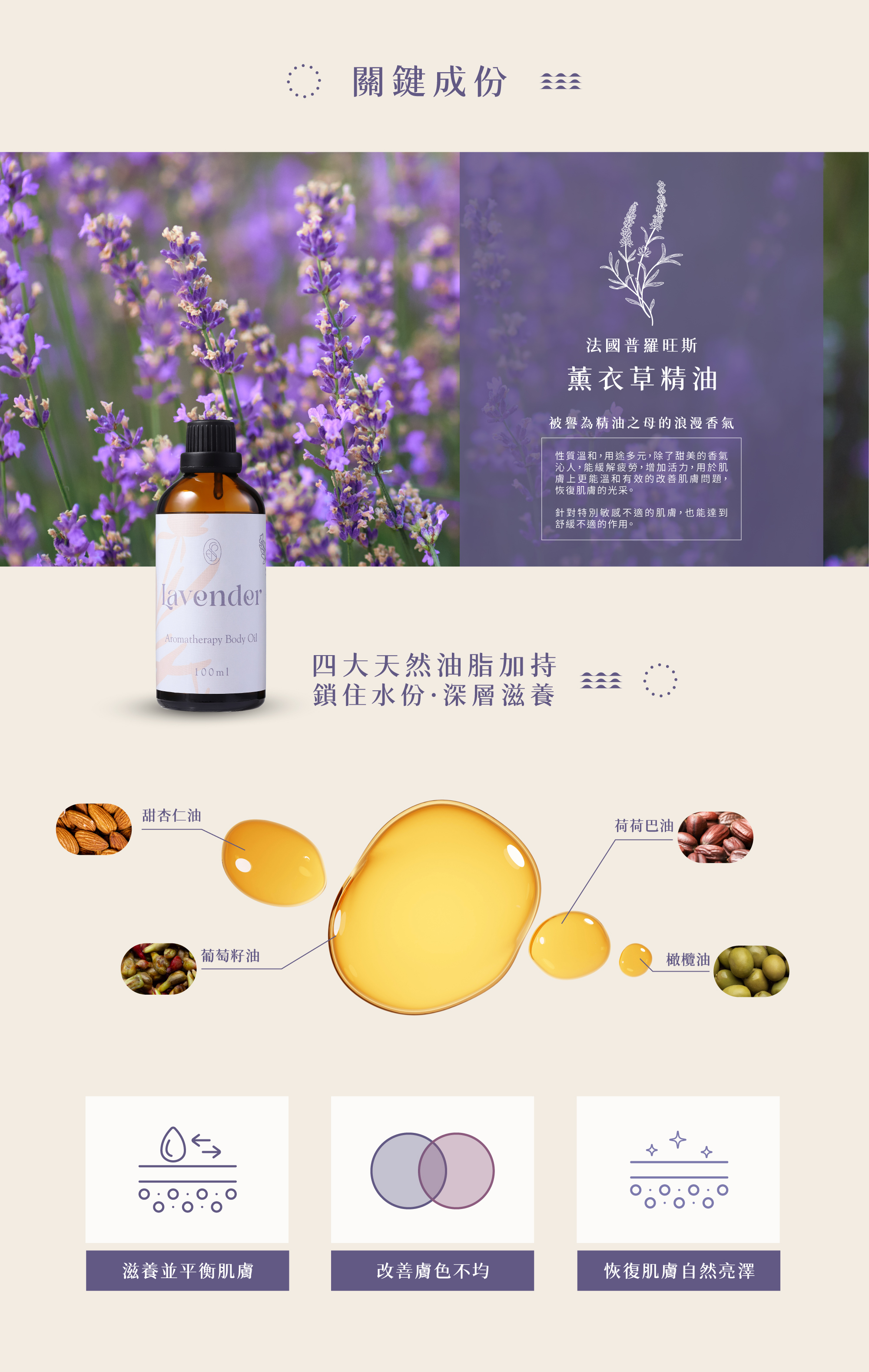 ●搭配四大天然萃取基底油加強肌膚滋養