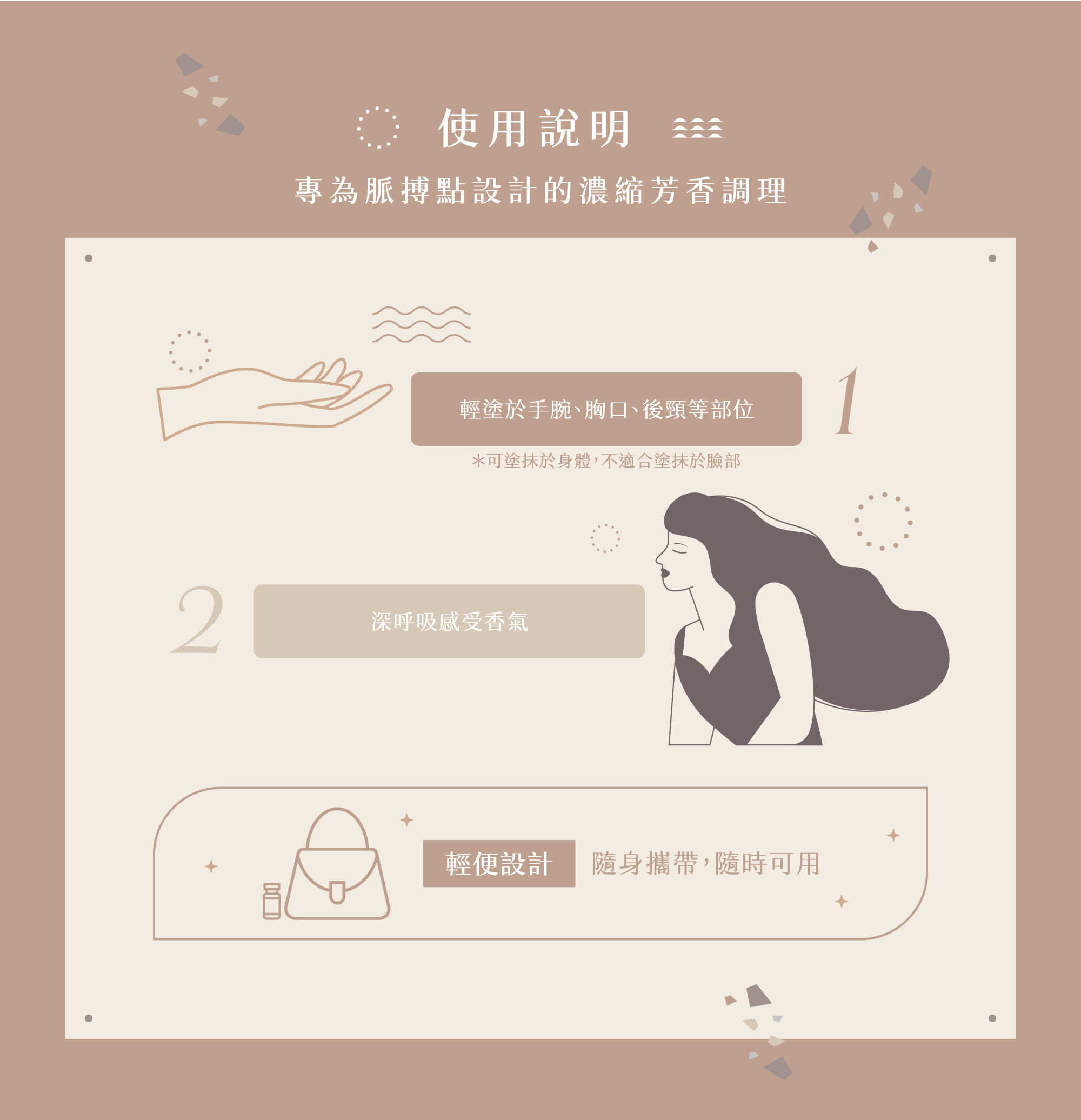 ●主要用途:專為脈搏點設計的芳香調理,喚醒專注力,穩定情緒