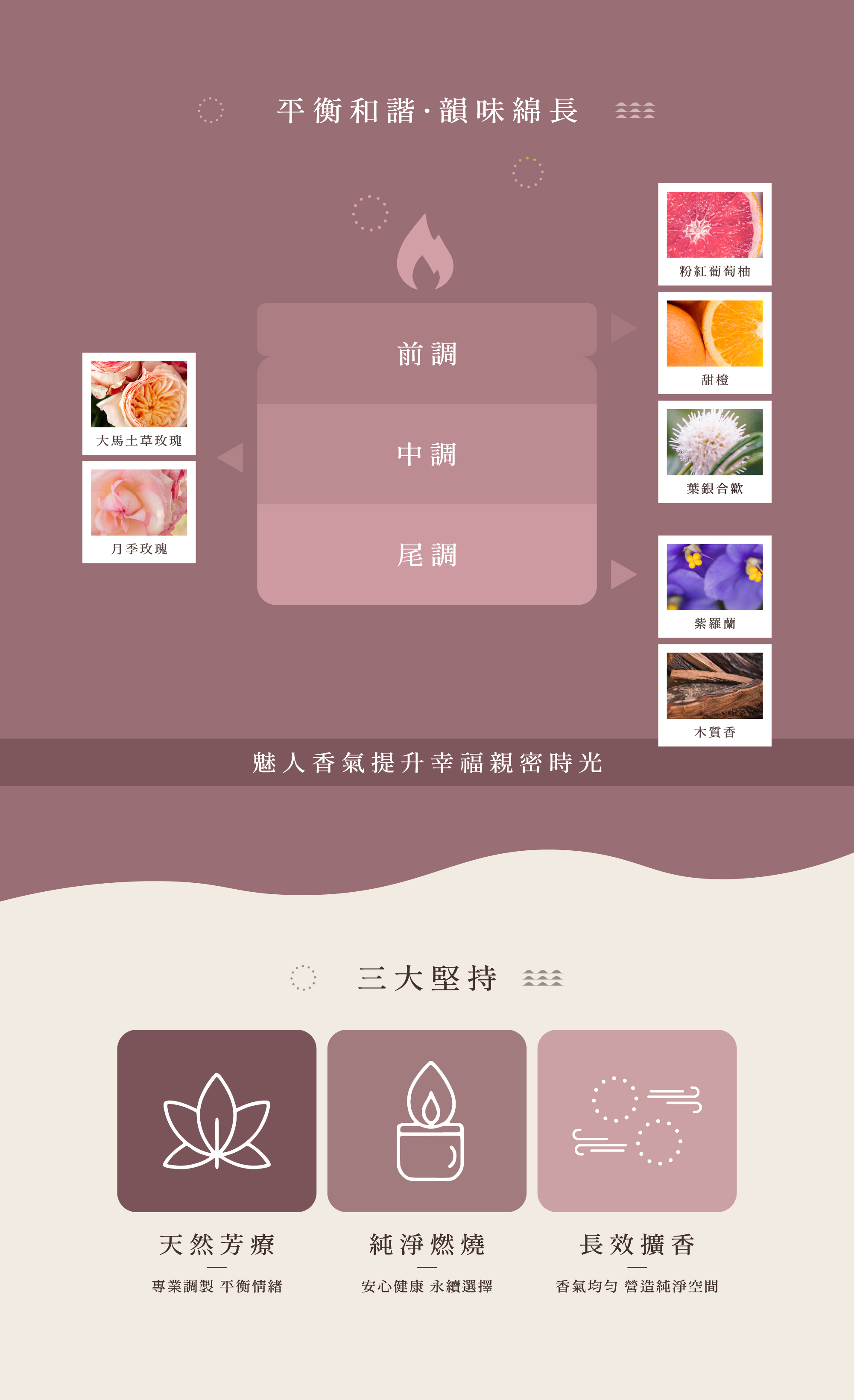 玫瑰嫣香氛蠟燭融合粉紅葡萄柚的明亮果香與月季玫瑰的細膩花韻,點燃後如漫步花園般營造幸福與愛的氛圍。